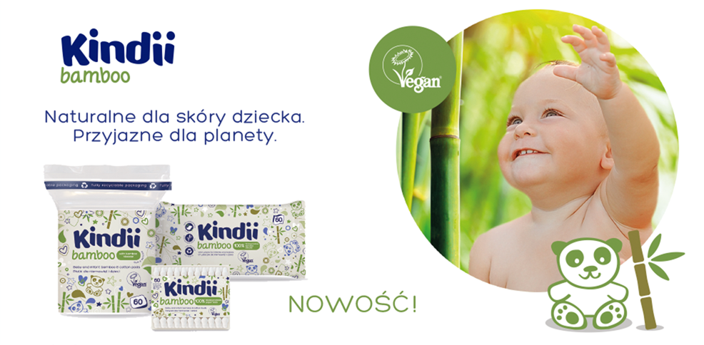Czy wiesz, że bambus to super roślina? Rośnie nawet do 3 razy szybciej niż najszybciej rosnące drzewo a włókniny pozyskane z bambusa są niezwykle miękkie i delikatne. Co więcej ekstrakt z bambusa wykazuje działanie nawilżające, odświeżające, regenerujące, antybakteryjne oraz antygrzybiczne. To właśnie ta super roślina była inspiracją dla Naszej nowej linii produktów Kindii Bamboo. Wszystkie produkty Kindii Bamboo wykonane są z biodegradowalnych surowców: chusteczki z wiskozy pochodzącej z bambusa, płatki z mieszanki włókien bambusowych oraz bawełnianych zaś patyczki z papieru oraz mieszanki włókien bawełnianych i bambusowych. Chusteczki zostały oczywiście wzbogacone o ekstrakt z bambusa a wszystkie opakowania produktów w pełni nadają się do recyklingu. Dbamy nie tylko o skórę Twojego Dziecka, ale również o Naszą planetę.