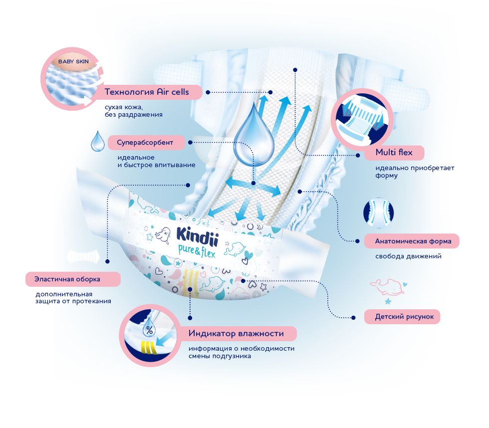 Подгузники Kindii Pure& Flex созданы для новорожденных с чувствительной кожей, идеальные с первых дней жизни. Инновационная технология Air Cells гарантирует воздухопроницаемость подгузника, а суперабсорбент обеспечивает быстрое и сбалансированное влагопоглащение. Кожа ребенка остается сухой, без раздражения и опрелостей. Уникальная система Multiflex обеспечивает идеальную посадку и прилегание подгузника вокруг ножек и в области поясницы, не ограничивая свободу и комфорт движения ребенка. Индикатор влажности указывает на необходимость смены подгузников. Продукт прошел дерматологические испытания. Предлагаемые размеры: 2 (3-6 кг), 3 (4-9 кг), 4 (7-14 кг), 5 (11-20 кг).