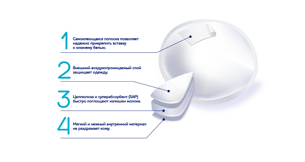Целлюлоза и суперабсорбент (SAP) быстро поглощают излишки молока, придавая ощущение комфорта. Они изготовлены из мягкого и дышащего материала, который не раздражает нежную кожу груди. Широкая самоклеящаяся полоска удерживает вставку на месте. Гигиенично упакованные по две штуки для одноразового использования. Прошли дерматологические тесты. Без запаха. Самоклеющаяся полоска позволяет надежно прикрепить вставку к нижнему белью. Внешний воздухопроницаемый слой защищает одежду. Целлюлоза и суперабсорбент (SAP) быстро поглощают излишки молока. Натуральная целлюлоза быстро впитывает излишки молока. Мягкий и нежный внутренний материал не раздражает кожу.